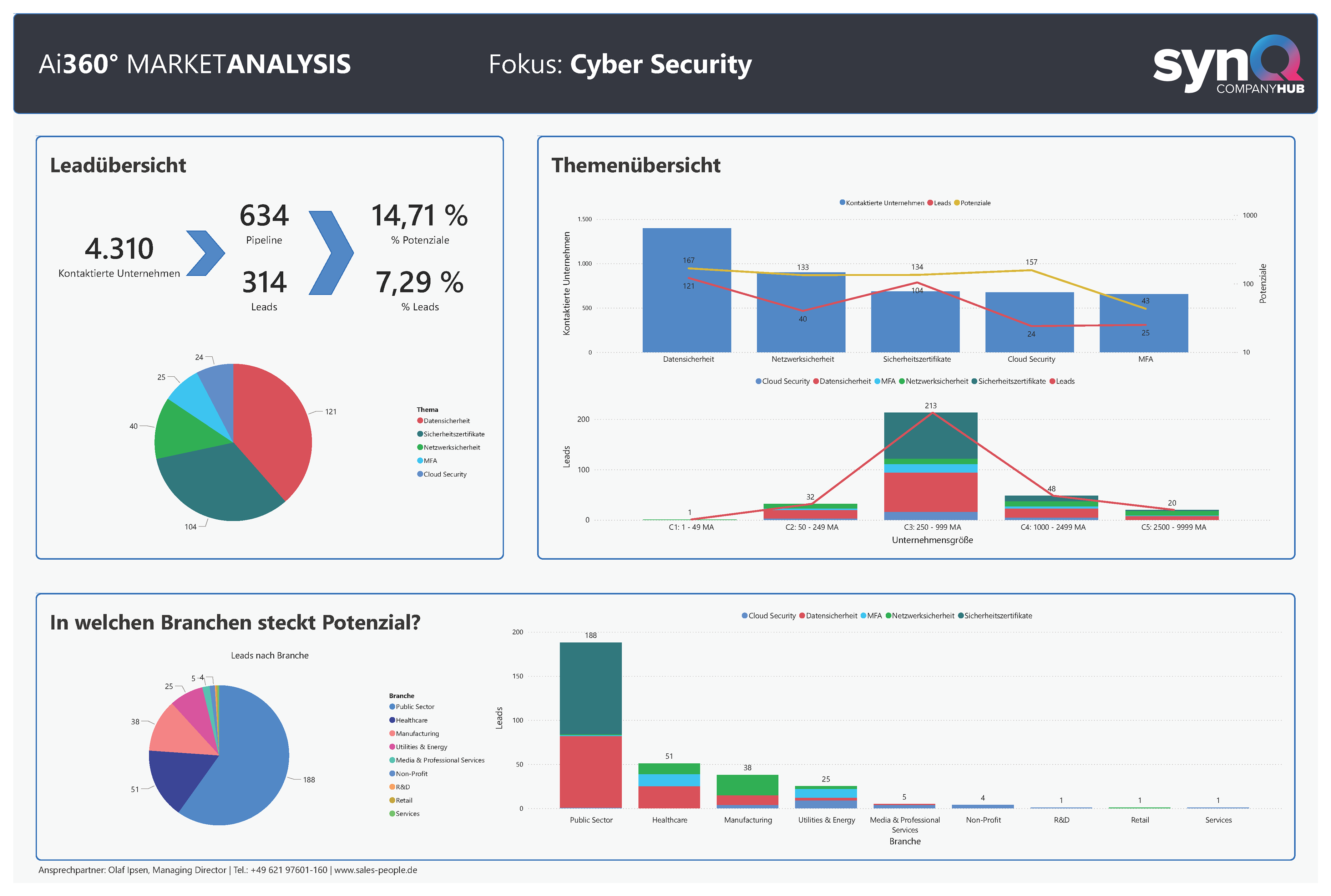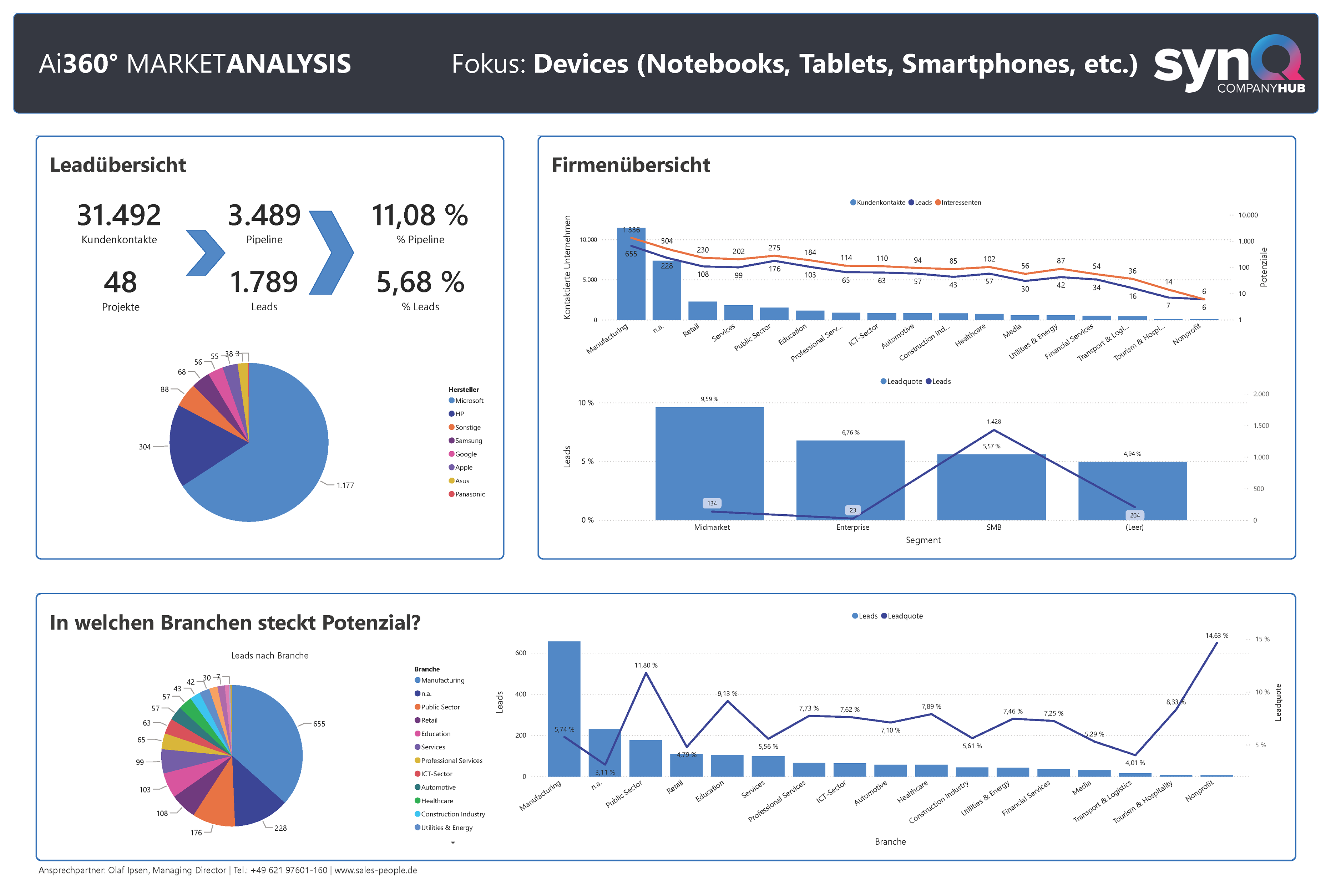 Sales People liefert die Antworten. Mit über 20 Jahren Erfahrung im IT-Vertrieb und mehr als einer Million Touchpoints in vielfältigen Branchen und IT-Themen analysieren wir kontinuierlich den Markt. So gewinnen wir präzise Einblicke in die Investitionsbereitschaft von Unternehmen: von den Bereichen, in denen verstärkt investiert wird, bis hin zu den relevanten Ansprechpartnern – stets aktuell, fundiert und aussagekräftig.